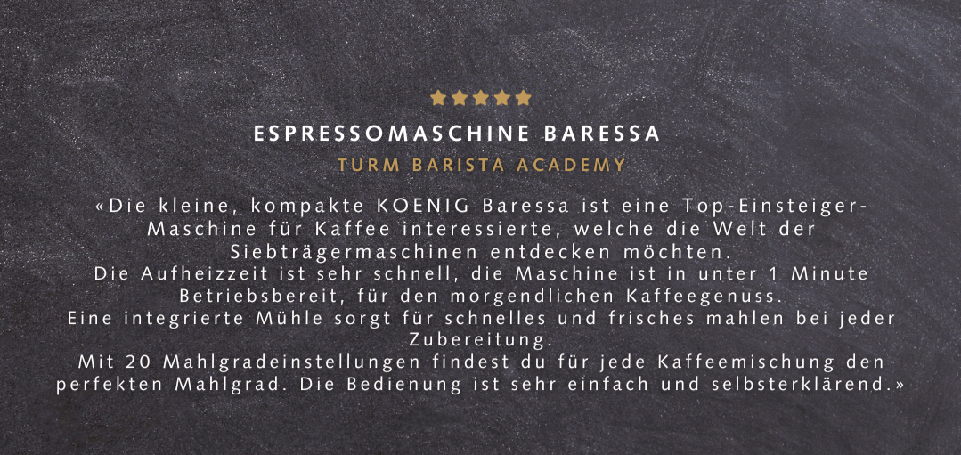 Wir freuen uns mitteilen zu können, dass der Barista-Profi der Turm Barista Academy unsere Espressomaschine Baressa von KOENIG getestet hat. Sein Feedback ist überwältigend: