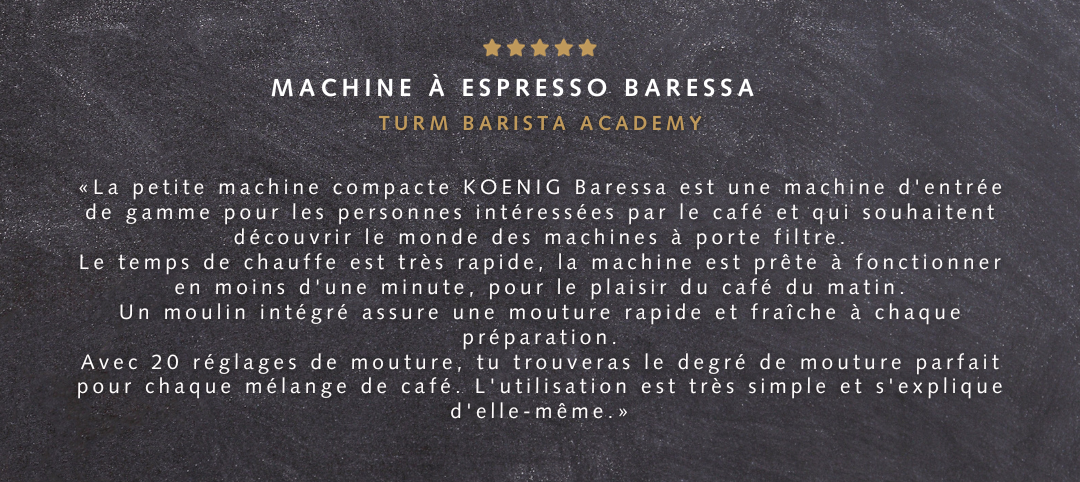Nous sommes heureux d'annoncer que le barista professionnel de la Turm Barista Academy a testé notre machine à expresso KOENIG Baressa. Ses retours sont écrasants :